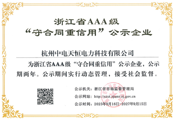 杭州中电天恒电力科技有限公司成立于2005年,总部位于美丽的西子湖畔,砥砺耕耘电力行业二十载,现已发展成为一家集研发、生产、销售为一体的高新技术企业,获得“国家高新技术企业”、“浙江省专精特新中小企业”、“浙江省规模以上制造企业”、“杭州市中电天恒智慧电网高新技术研究开发中心”、“浙江省AAA级守合同重信用企业”等荣誉称号。